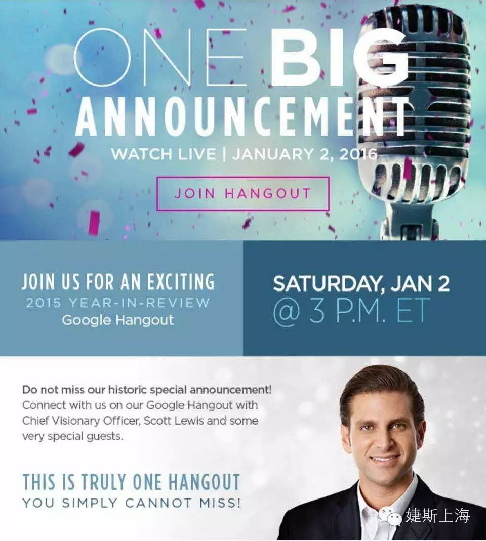 Kimhui 號召大家:無論多麼輝煌的過去,從今天起,從2016的年首起,我們每一個婕斯家人,都不要放棄自己夢想,給自己一個新年的承諾,實現自己的幸福。 整個視頻幾位創始人飽含深情,對公司六年的奇跡感慨萬分,他們感恩所有婕斯家人,並說他們意識到婕斯家人對他們信任和期待,他們將不會滿足于目前的輝煌,帶領婕斯家人奔向下一個億萬業績,説明到更多的婕斯家人。